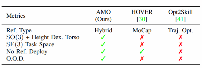 与两项最近的代表性人形运动模仿工作的比较。Dex. Torso 表示机器人是否能够调整其躯干的方向和高度以扩展工作空间。Task Space 指的是末端执行器。No Ref. Deploy 表示机器人在部署过程中是否需要参考运动。O.O.D. 表示该工作是否评估了分布外性能,这在机器人由人类操作员控制且控制信号高度不可预测时是一个典型情况。