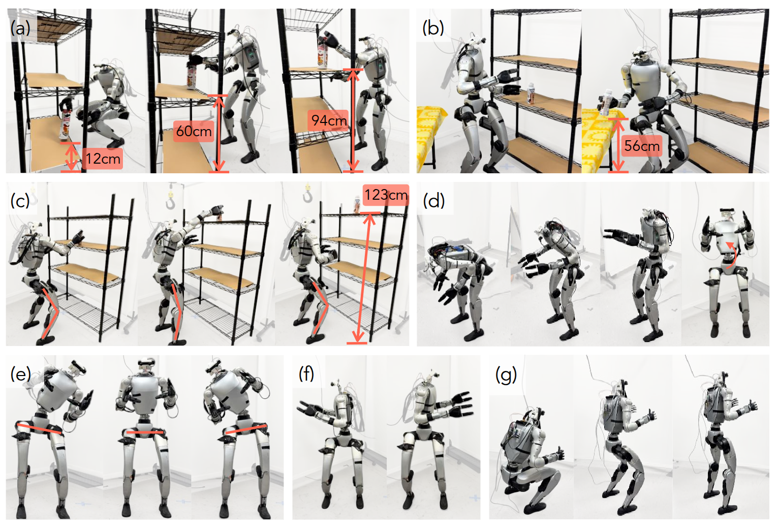 如上所示,人型机器人不在只是单纯的上半身操作,或者下肢行走,而遇到了越来越多的 loco-manipulation 问题 ——既涉及运动控制也涉及操作,最简单的比如搬运箱子,以及从地面拾取物品。这涵盖了对不同高度物体的操作,腿部姿态髋部姿态,站立蹲伏等。