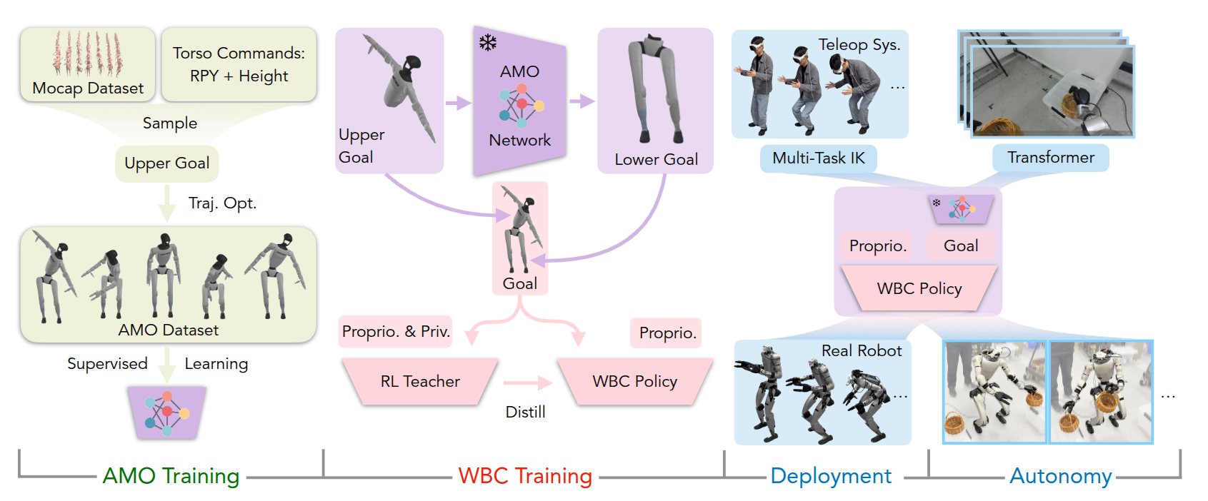 - 混合运动合成:将动作捕捉数据中的手臂轨迹与概率采样的躯干方向融合,制定了混合上肢命令集,系统地消除了训练分布中的运动学偏差。这些命令驱动一个动态感知的轨迹优化器,产生满足运动学可行性和动态约束的全身参考运动,从而构建了 AMO 数据集——第一个专门为人形机器人的灵巧行走和操作而设计的动作库。