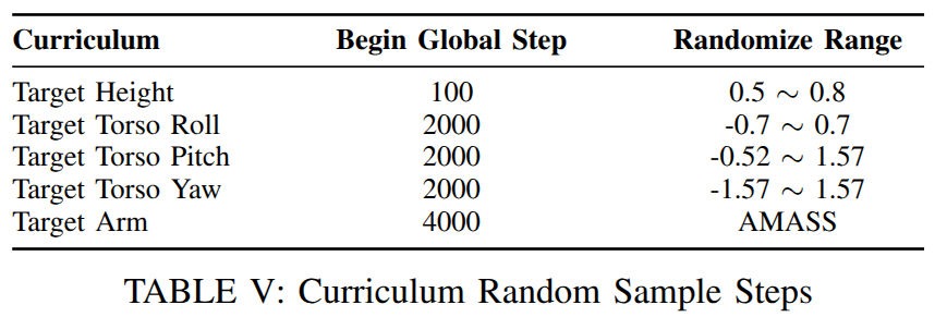 - 最后,从 AMASS 数据集中采样手臂动作,并直接在环境中设置手臂关节的目标位置。按照训练计划,教师策略逐步掌握复杂的全身控制设定,并能够监督现实世界中的学生
