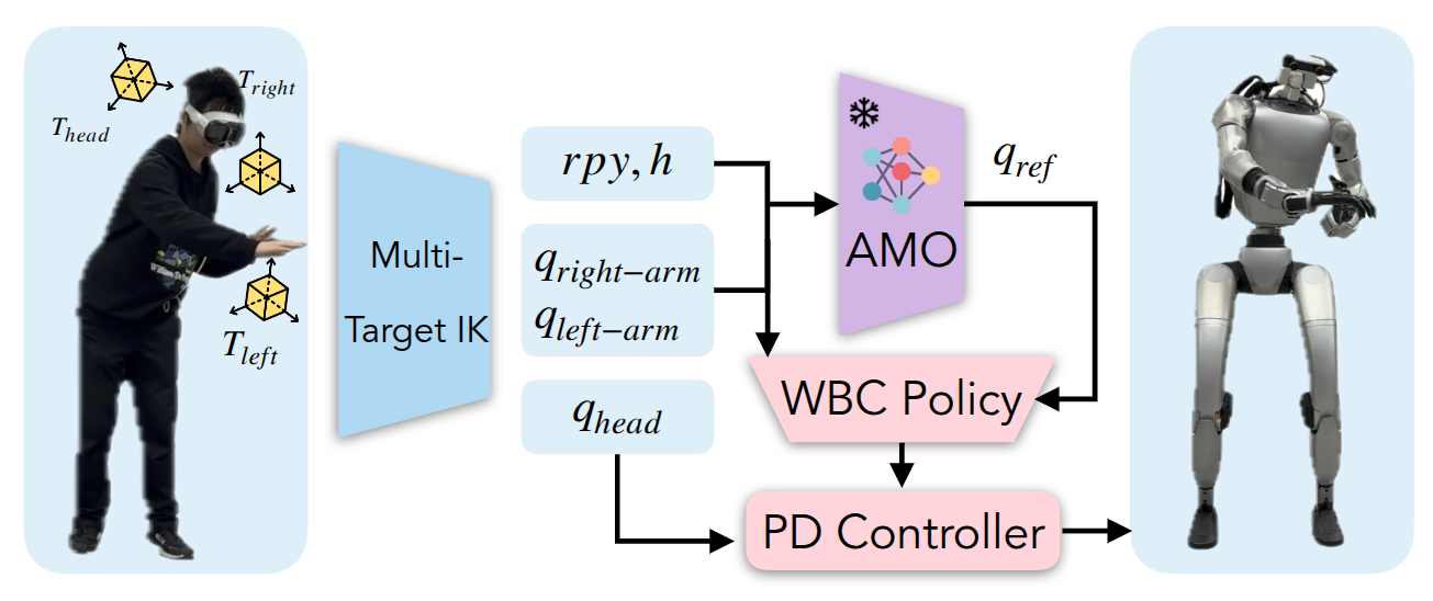 - 可泛化的策略训练:虽然直接的解决方案是通过离散查找表将命令映射到运动,但这些方法本质上仅限于离散的、在分布内的场景。我们的 AMO 网络则学习连续映射,能够在连续输入空间和分布外(O.O.D.)遥操作命令之间进行稳健的插值,同时保持实时响应性。在部署过程中,首先从 VR 遥操作系统中提取稀疏姿态,并输出上肢目标,使用多目标逆运动学,经过训练 的 AMO 网络和 RL 策略共同输出机器人的控制信号。