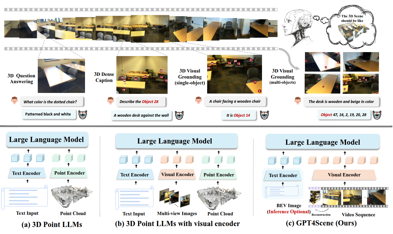 三维场景理解旨在理解周围复杂环境的整体布局以及物体之间的空间关系,它在具身智能、虚拟现实和智能城市等应用中发挥着关键作用。随着大语言模型的快速发展,视觉 - 语言模型在图像和视频理解方面表现出色 。研究人员通过引入点云,将这一范式扩展到三维感知,以提高场景理解能力。最近的三维点大语言模型利用与大语言模型特征对齐的点云进行室内场景理解。尽管在点云和图像结合的点 - 视觉 - 大语言模型范式中,通过更丰富的视觉线索提高了性能,但将这些模态与文本对齐仍然具有挑战性。