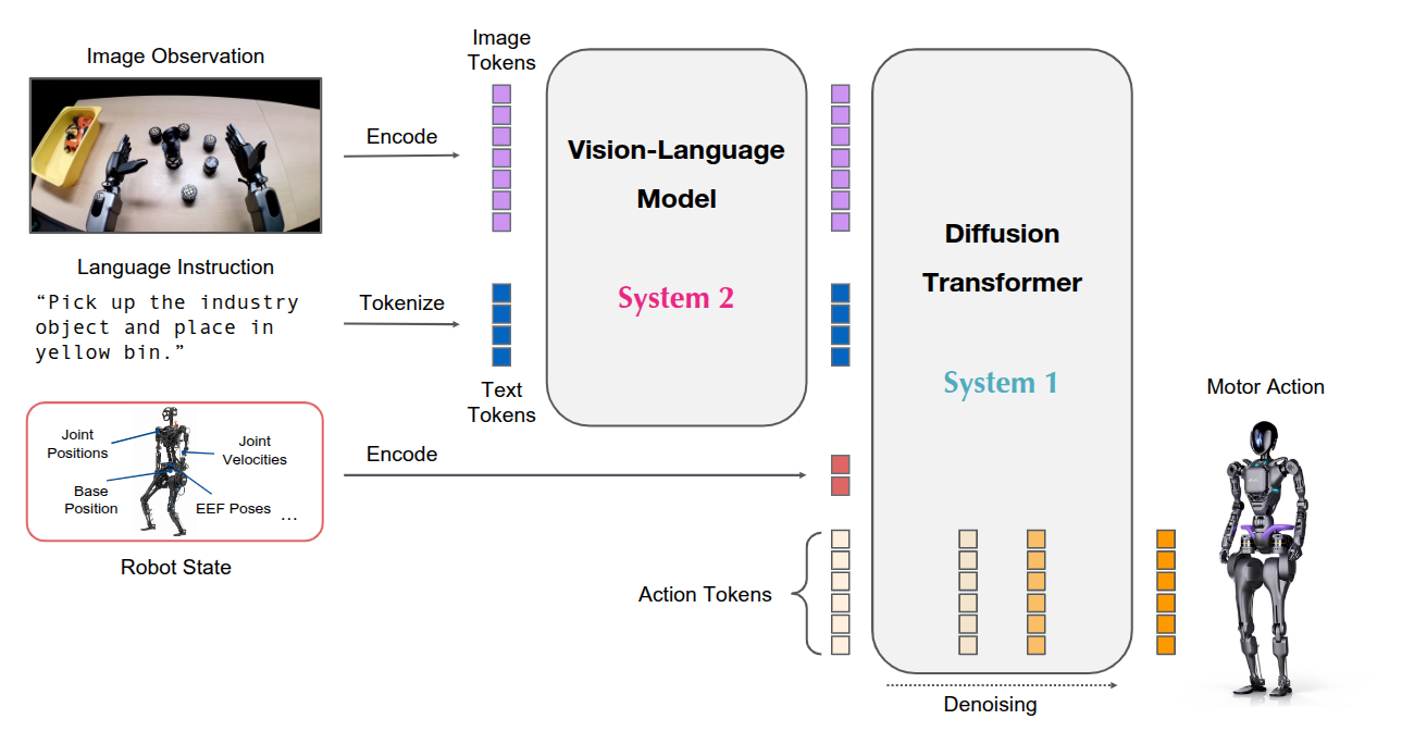 - 设计了一个组合模型,将基于 VLM 的推理模块(系统 2)和基于 DiT 的动作模块整合到一个统一的学习框架中;