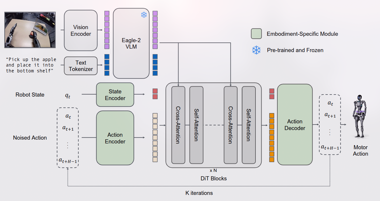 /使用 NVIDIA Eagle-2 VLM 作为视觉语言骨干网络。具体来说,我们公开发布的 GR00T-N1-2B 模型总共拥有 22 亿参数,其中 VLM 部分有 13.4 亿参数。在 L40 GPU 上使用 bf16 时,采样 16 个动作片段的推理时间为 63.9 毫秒。 GR00T N1 的三个关键特点:
