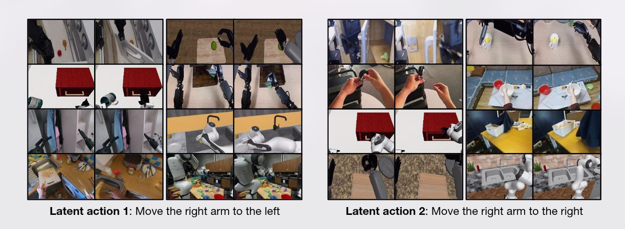 对于人类第一人称视频和神经轨迹,我们没有可以直接用于训练 GR00T N1 的动作。对于这些数据,我们通过训练一个 VQ-VAE 模型从视频中的连续图像帧中提取特征来生成潜在动作(Ye 等人,2025)。编码器接收视频中固定窗口大小 的当前帧 和未来帧 ,并输出潜在动作 。解码器被训练为接收潜在动作 和 ,并重建 。该模型使用 VQ-VAE 目标进行训练,其中编码器的连续嵌入被映射到码本中最近的嵌入。训练完成后,我们取编码器并将其用作逆动力学模型;给定一个 和 对,我们提取连续的预量化嵌入,并将其用作预训练期间的潜在动作标签,使用相同的流匹配损失,但将其视为一个独立的“LAPA”实体。在所有异构数据上一起训练 VQ-VAE 模型,使我们能够统一所有数据,使其共享相同的已学习潜在动作空间,从而可能提高跨实体泛化能力。下图展示了来自 8 种不同实体(包括机器人和人类实体)的 和 对,所有这些对都是从相似的潜在动作中检索到的;第一个潜在动作显示所有实体将右臂向左移动,第二个潜在动作显示将右臂向右移动。