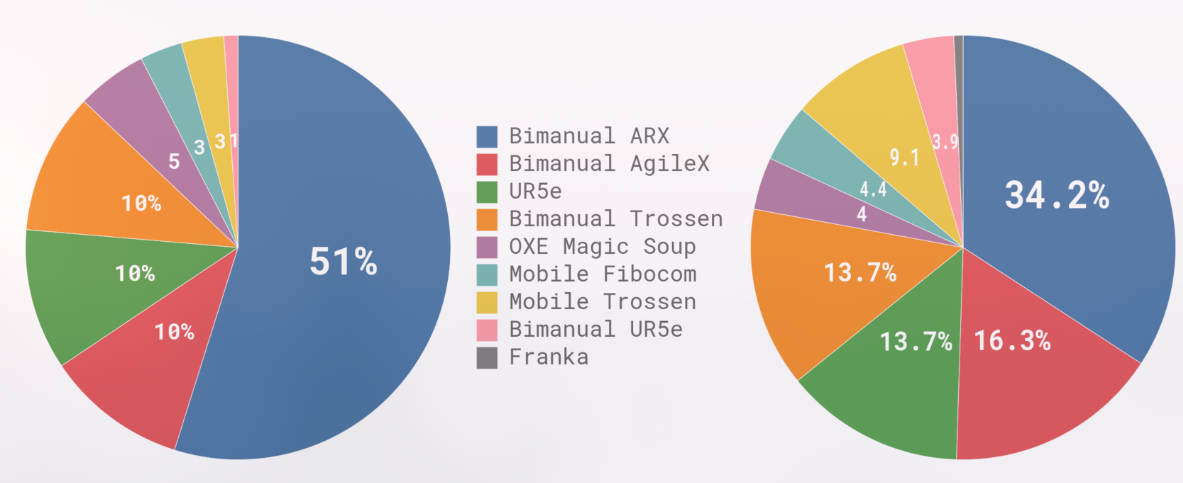 右图说明了预训练混合数据集中不同数据集的权重。左图说明了它们相对于步数(可能是 timestep)的大小。对于有些 robot-task 组合比较多的数据,加权值为 , 为数据集的样本数 量。