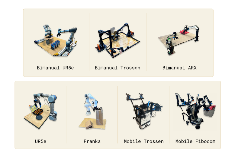 - 讨论了如何在多个灵巧机器人平台(包括单臂机器人、双臂机器人和移动操作机器人)上收集的庞大且多样化的数据集上训练该模型。