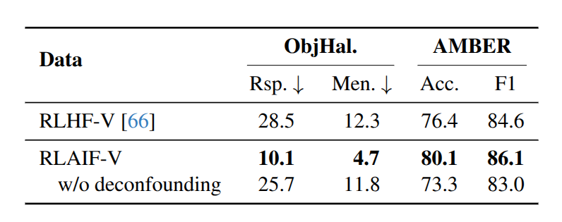 - RLAIF-V 无去混杂,将去混杂策略下生成的首选响应替换为原始人类标注。