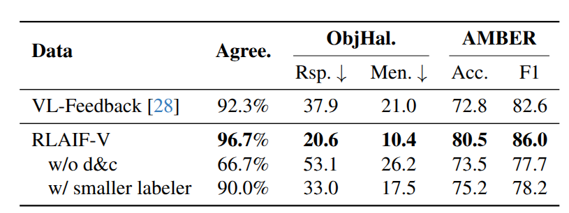 在分析了 RLHF-V 数据集的构成后,发现其只包括有限的模型选择,这些模型与 LLaVA 1.5 7B 的幻觉分布相似性有限。因此,该数据集的有效性显著降低。这一现象进一步凸显了 RLAIF-V 框架的重要性,该框架可以高效地为任何 MLLM 生成高质量反馈数据。