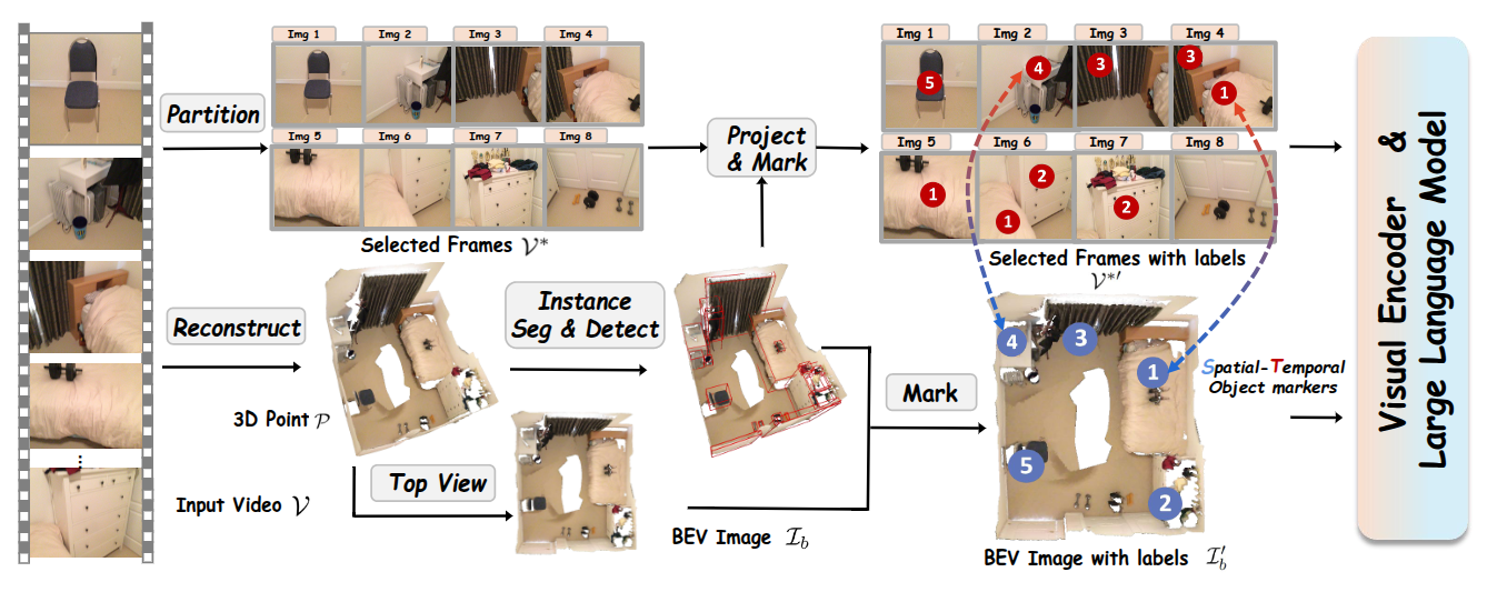 - 首先对输入视频进行三维重建,生成鸟瞰图(BEV)图像,提供全面的场景布局。